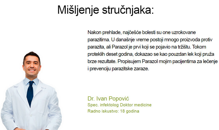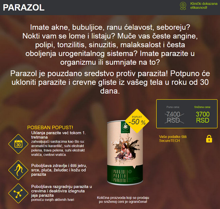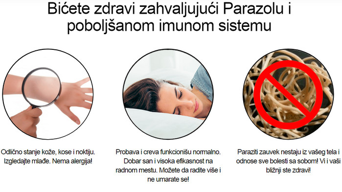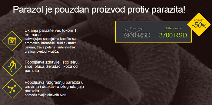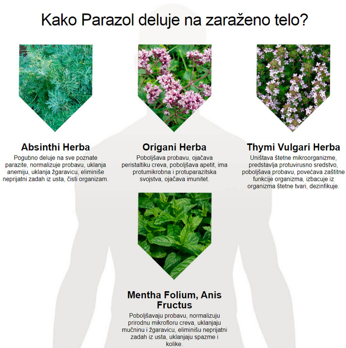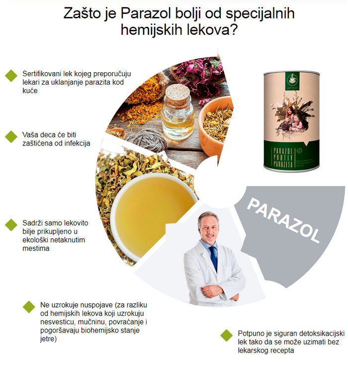 Parazol – inovativan proizvod na bazi prirodnih sastojaka koji štetno djeluju na gliste i ne štete organizmu. Lijek Parazol vrlo je efikasan protiv raznih vrsta parazita koji ulaze u ljudsko tijelo. Prednost predstavljenog alata je u tome što se preporučuje za prijem ne samo odraslima, već i djeci. Sertifikovani, helmintički preporučeni kućni lijek za uklanjanje parazita. Ima ugodan ukus koji će djeca voljeti. Sastoji se isključivo od ljekovitog bilja sakupljenog na ekološki čistim mjestima.